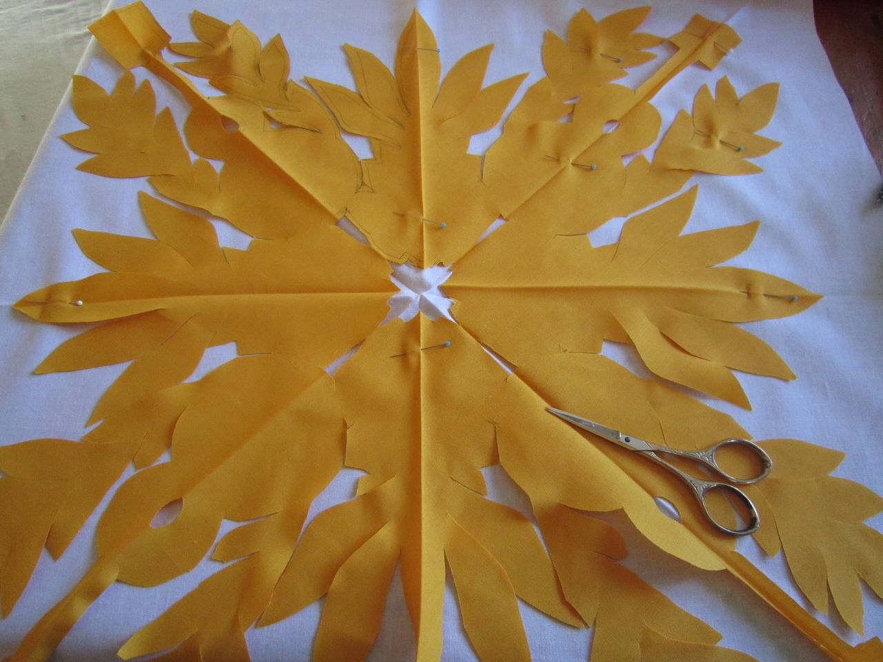 土台、黄色8等分を重ねて待ち針を打ち、しつけでとめます